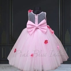 This big bow party dress in pink makes a perfect boutique birthday dress for your princess. This sleeveless big bow party dress for toddlers to teenage girls is made with net and comes with a transparent back with flowers scattered all over. Designed in different sizes ranging from 1 to 12 years of age, this exceptionally pretty party wear gown comes with a complementary hair band or clip to do her hair right.