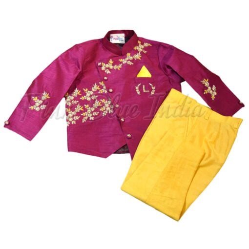 A classy jacket and pant set in purple and yellow color makes a desirable piece of clothing for baby boys in India. Have the weddings, festivals and other occasions more stylish for your little prince with this raw silk jacket with hand embroidery. This stunning ethnic jacket comes with a personalized name embroidery to make it stand out. Buy online this exclusive customized jacket and pant set for your little boy to have his dressed smartly for occasions.