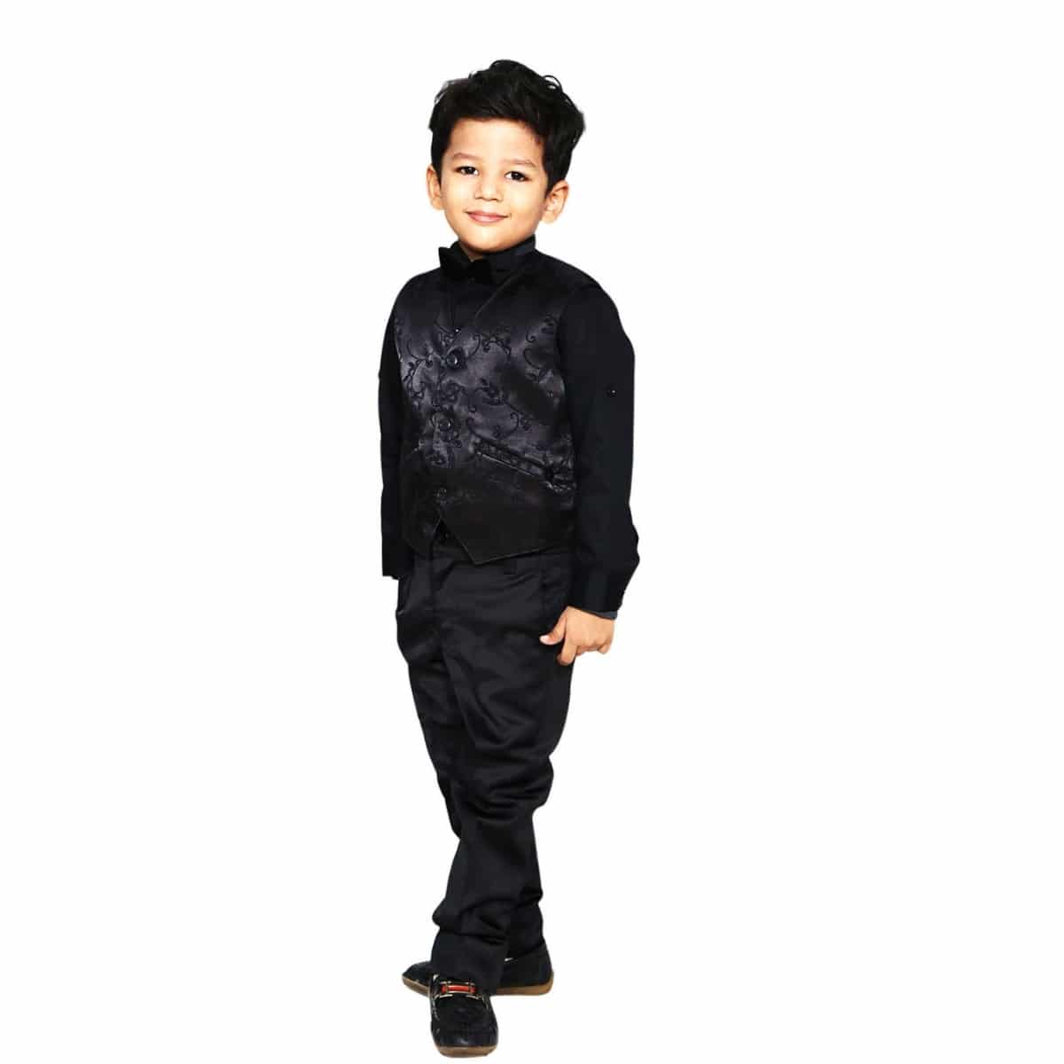 The three piece little boy tuxedo black is a beautiful kids wedding outfit to glamour up the occasion. Crafted in pure cotton fabric, the piece comes with ring bearer tuxedo, waistcoat and matching bow tie. This 3 piece set is one of the attractive fashion wear for boys and children. grab the tuxedo for baby boy and tuxedo for teenager to make your heartthrob boy look handsome. The kids Tuxedos & Formal wear for Weddings & Special Occasions are available at affordable prices at our site. You can also purchase toddler boy tuxedo shirt, Waistcoat and matching Bow tie here. So hurry up and shop soon!