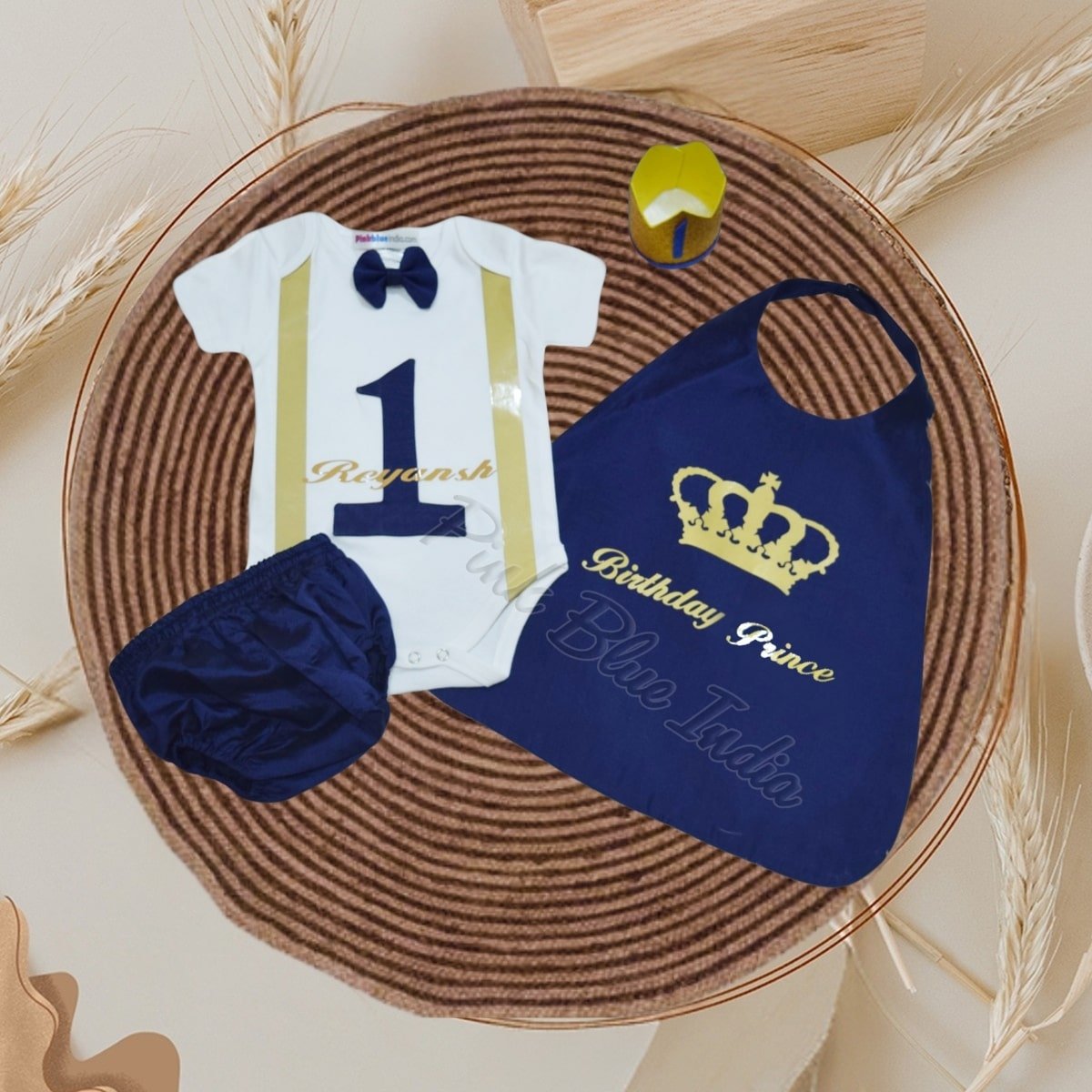 A cute and adorable cake smash outfit for boys in blue and white. This first birthday outfit consists of a onesie with a bow, a cape, a bow, a pair of bloomers and a complementary crown to complete the look for the photoshoot. This cake smash dress for baby boy can be shopped for boys of age 0-3months to 18-24 months. He is going to look just perfect dressed in this complete outfit that is made of cotton.