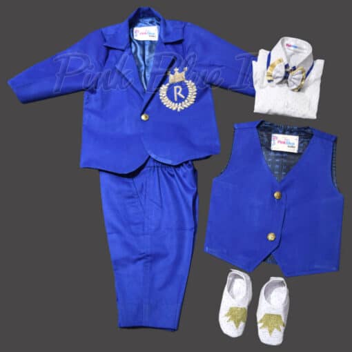 He is going to look nothing less than a price dressed in this blue colored 5 piece formal suit for baby boys with personalized name initials on the jacket. It comprises of a pair of pants, shirt, waistcoat, bowtie and blazer; this makes a complete ensemble to dress up baby boys for birthday parties, weddings and even photoshoots so that they always look the best. This combination comes with booties for babies up to 1 year of age.