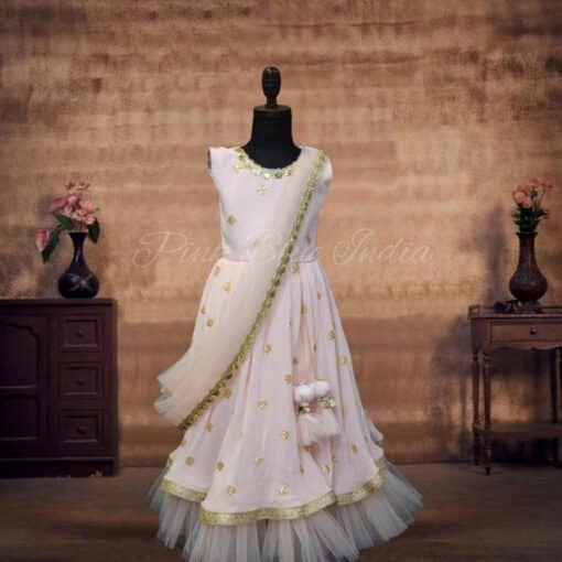 Exclusive baby pink Indo Western gown is a designer masterpiece with an attached dupatta, it gives your daughter a graceful look. Perfect for Indian weddings.