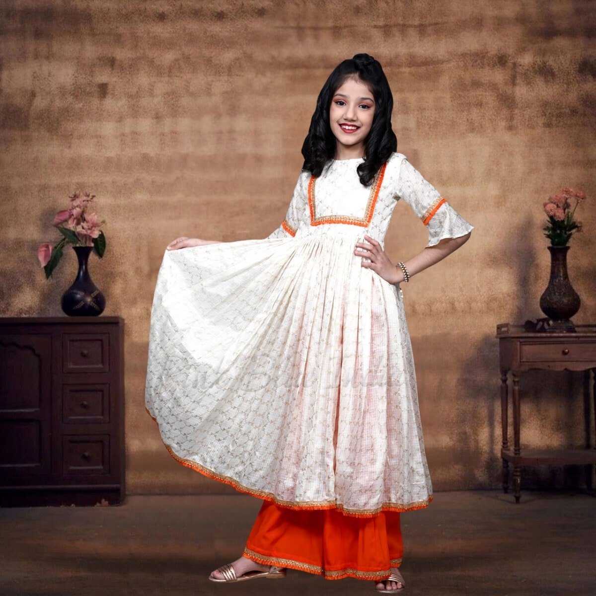 She is going to look the prettiest dressed in this soothing combination of off-white Chanderi gown and orange palazzos. The golden self-designed gown adds some bling to this simple attire. The bodice, sleeves and flare have golden and orange piping to add more colour to this ethnic outfit. Dress up girls between 1 to 15 years of age in this refreshing Indo-western set which makes a promising wear for small wedding functions and festivals.