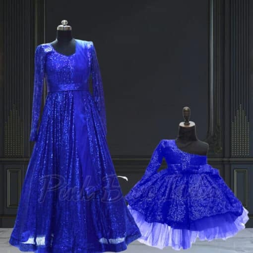 Shop for the most beautiful mother daughter combo long gown in blue sequins. The mother gown is available in sizes ranging from XS to XXL and comes with dupatta and belt. The baby girl sizes include 1 to 12 years and is a knee length one shoulder dress. This unique baby, mommy and me dress comes with a graceful coordinating matching gown. The combo also includes a matching hair accessory so that the duo looks perfectly matched for Indian wedding celebrations and special occasions. Matching mother daughter outfits bring them together. Perfect for playing, sleeping, celebrating. Start the memory making today!