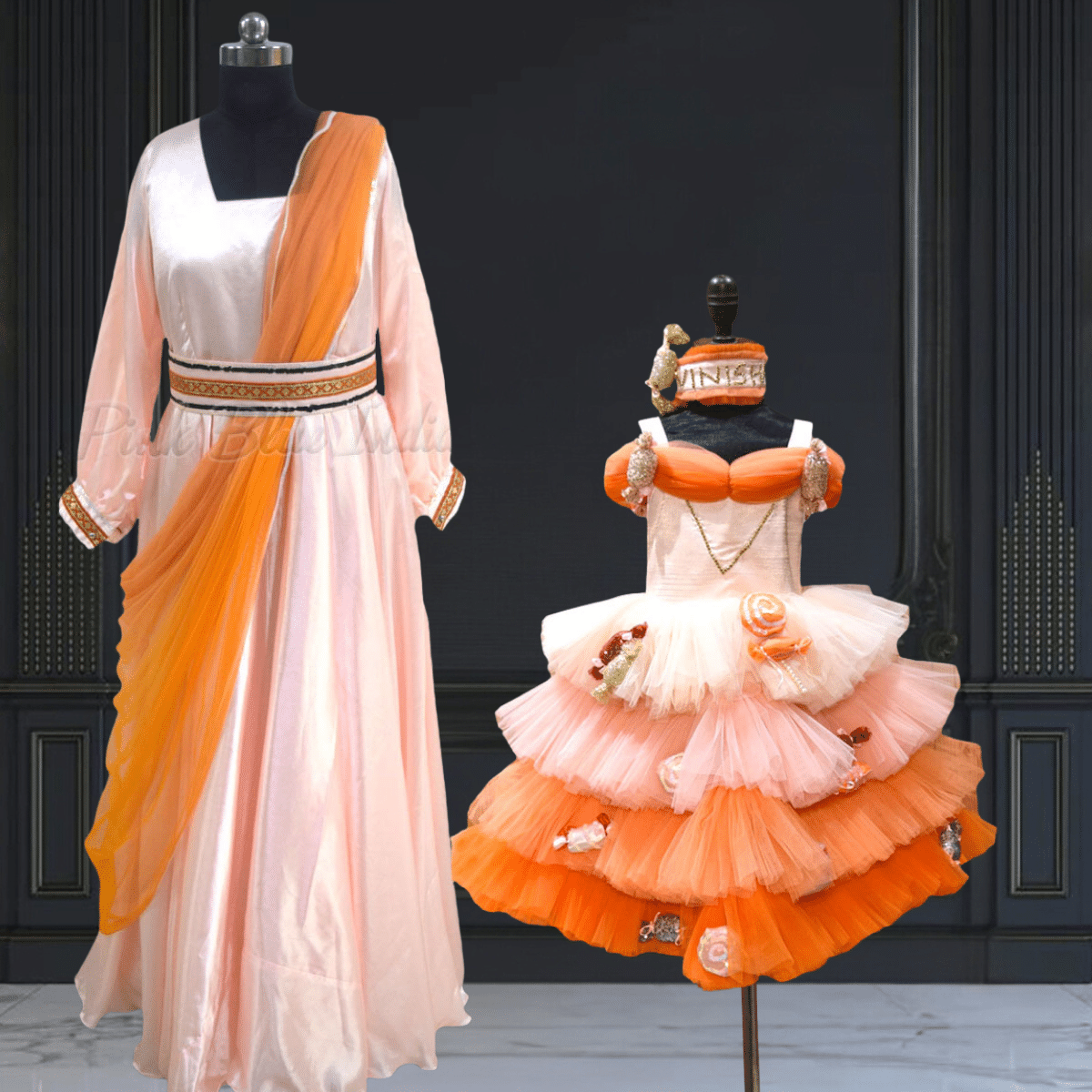 If a candy themed party is one your mind then this customized matching candy themed mother daughter gown makes a fabulous choice of clothing to dress in coordination. This is a combination of peach colored gown in satin and net for the duo to dress pretty. The gown for the mother comes with an attached dupatta and belt and the one for the daughter is studded with candy motifs and layered flare. The matching hair accessory completes her look with the right hairstyle to flaunt.