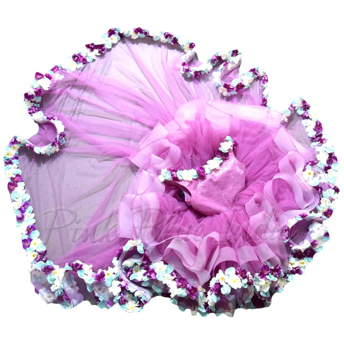 This purple off shoulder gown with long tail makes a beautiful designer gown for birthday parties and weddings. Adorned with flowers on the neckline and hem, this net off shoulder tail gown for 6 months to 12 year old baby girls makes a lovely outfit to have them dressed on special occasions. It comes with a matching hair accessory for a perfect hairdo.