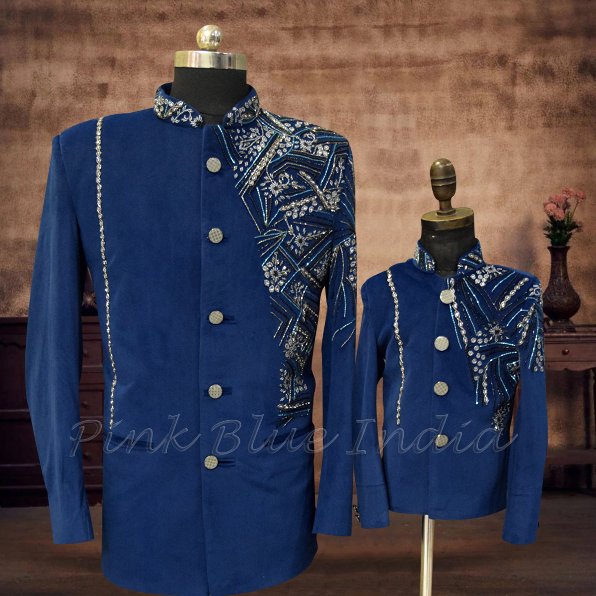 Like father, like son—two generations, one royal legacy. Dress in our premium velvet Jodhpuri suits with handwork and make your family wedding unforgettable.