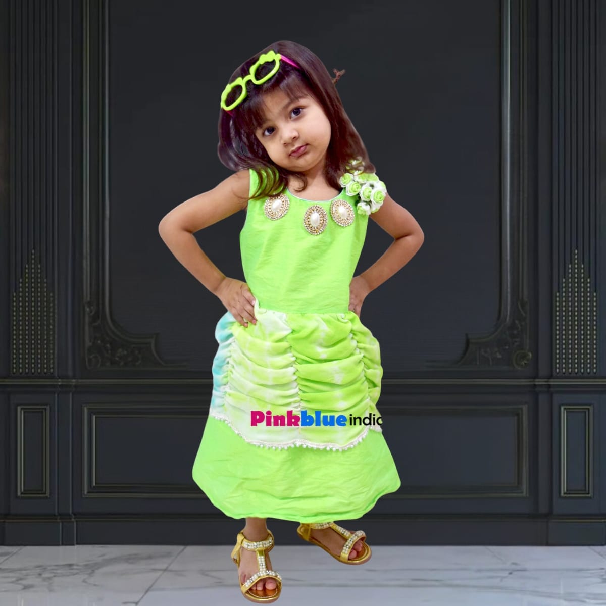 Buy online in India the beautiful party dress for your young girls. This classy neon green wedding dress is made with raw silk fabric with gorgeous flares in shibori in pure georgette. This festive kids clothing is designer birthday attire for your child with a dressy neckline consisting of beautiful embellishments for a perfect glamorous look.