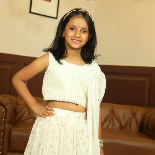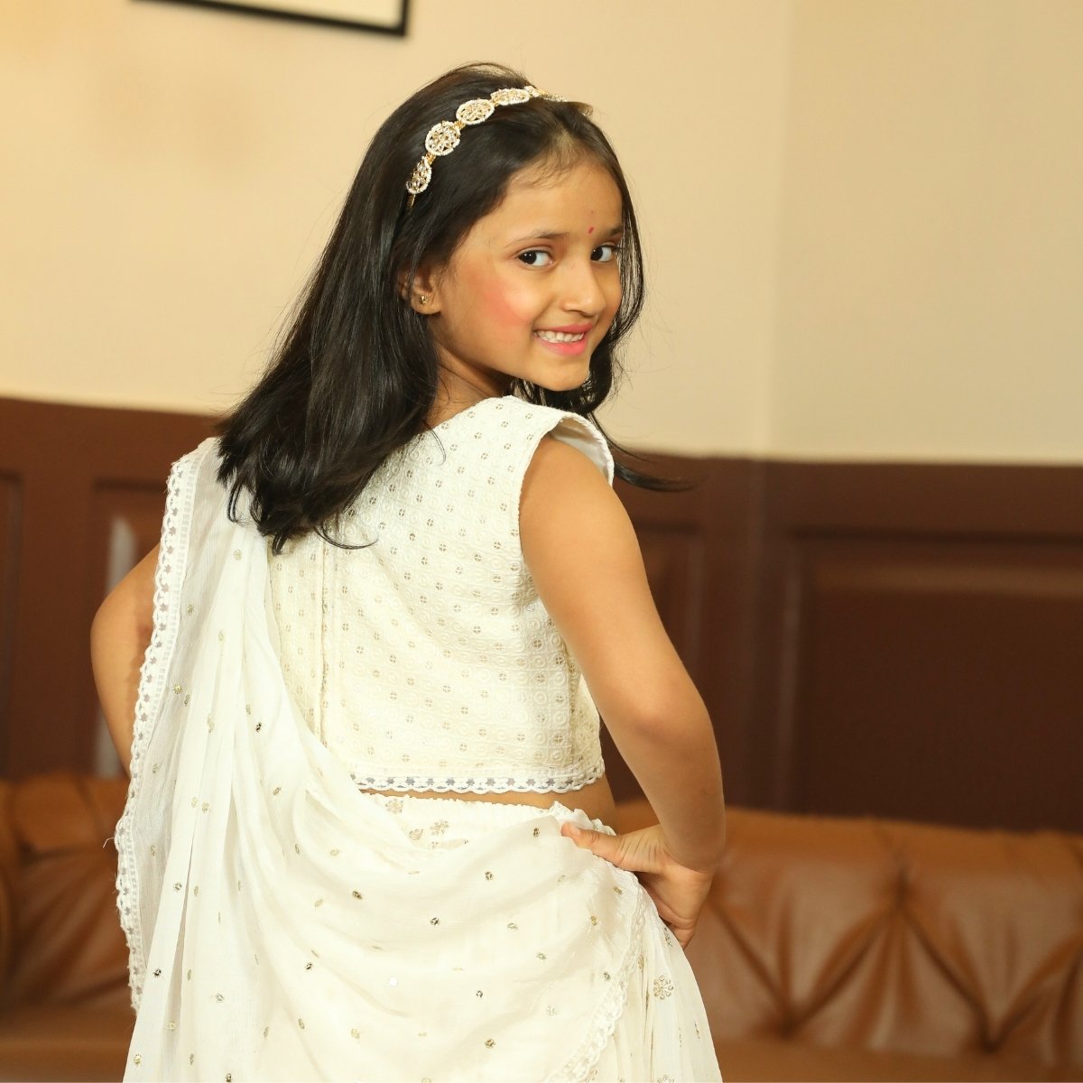 White georgette lehenga set for girls. Perfect for weddings, family functions and festive celebrations. Light, graceful and designed for easy movement.