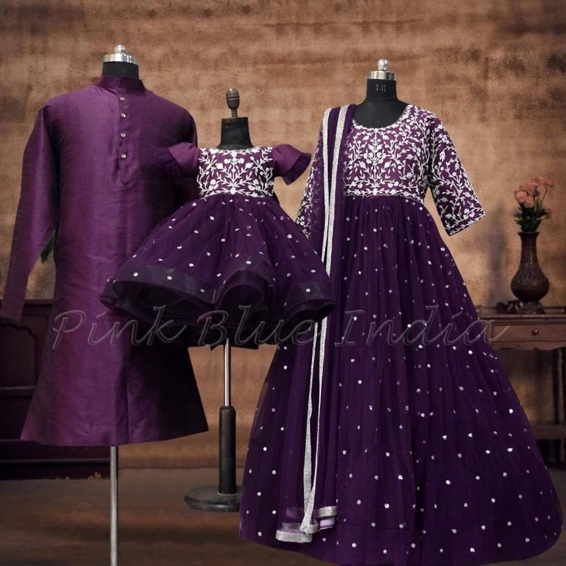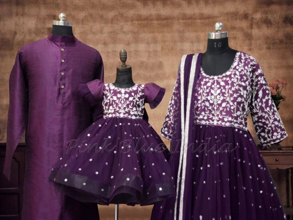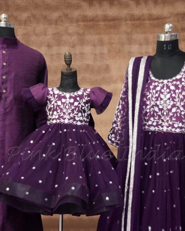 Celebrate your family wedding in style with our ethnic purple family matching set featuring beautiful handwork in raw silk. Perfect for the entire family.