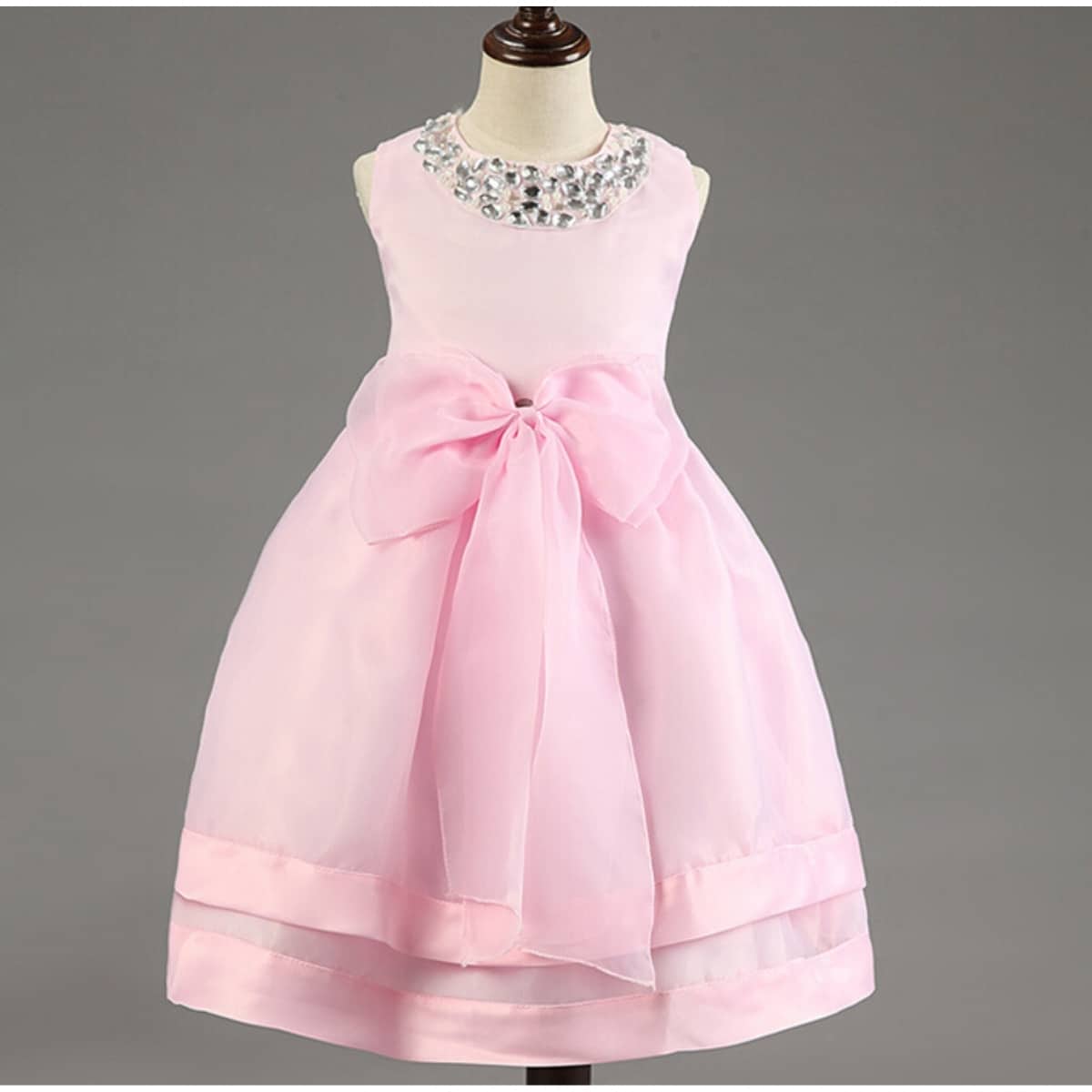 Buy online in India the beautiful formal party dress for your young girl. The sleeveless baby pink designer outfit comes with classy work on the neckline and a big bow on the waist. Dress up your daughter like a princess in this gorgeous birthday dress. This is the most stylish outfit for your cute little girl for weddings.