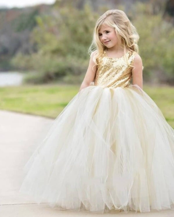 Dress her for special occasions in this heavenly long dress for kids. Golden sleeveless bodice with sequins and white net flare makes this an awesome birthday gown for kids in India. Buy online for this custom handmade long gown dress for baby girl which comes in sizes ranging from 6 months to 15 years. What makes it a perfect kids sequins dress because it comes with a matching hair accessory and worldwide shipping.