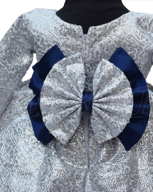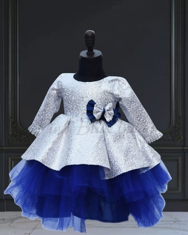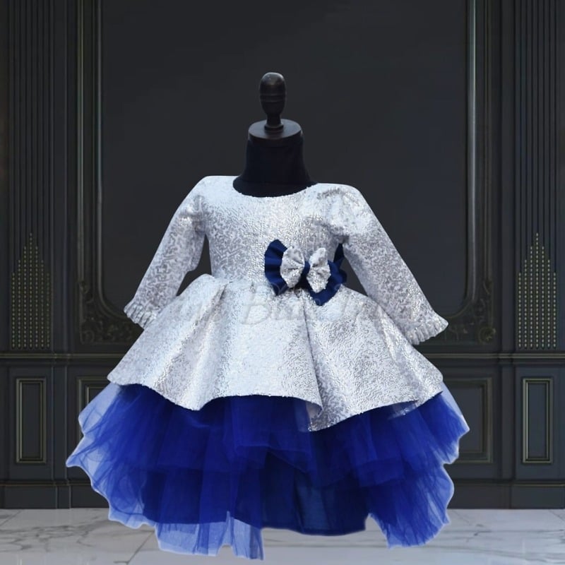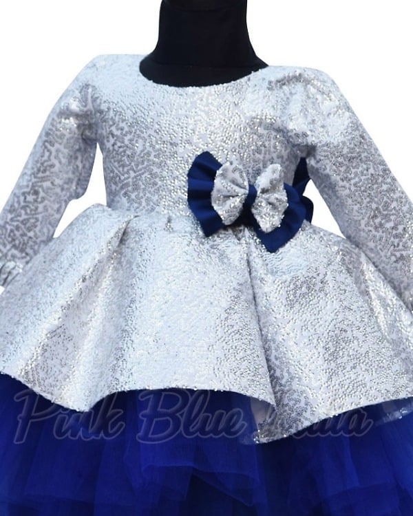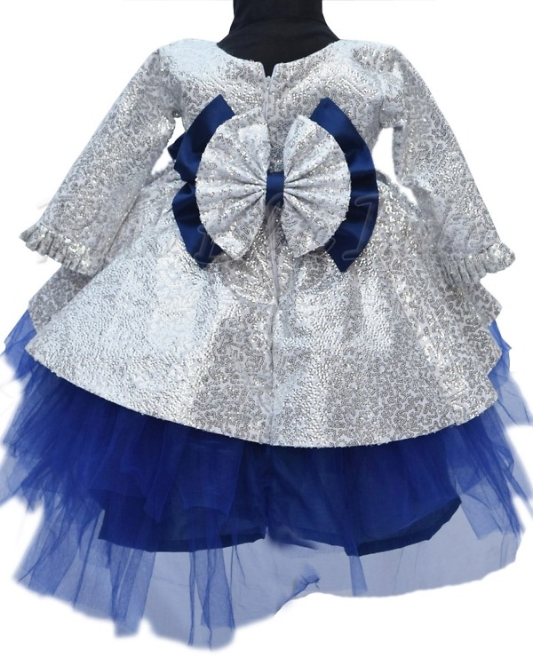 A sophisticated fancy baby frock in silver is just what you need for your daughter on her birthday. A beautifully fitted sequins bodice and a contrasting blue net fare makes a delightful layered stylish baby frock. This designer sequins dress for girls has a sparkling bow on the waist and comes with matching hair accessory. Find it in different sizes ranging from 1 to 12 years, this is a perfect birthday dress for baby girl to shop online at PinkBlueIndia.