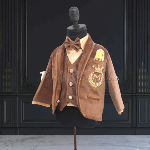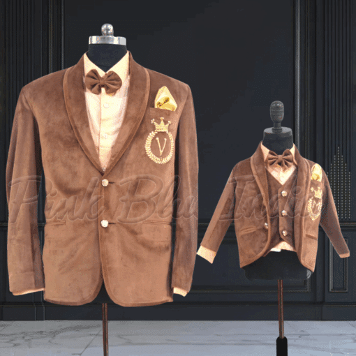 This custom made dad and son velvet party wear coat suit in brown color makes a classy pick. This father son coat suit comes with personalized name initials embroidered on the chest pocket. Shop online this stunning coat combo for the duo which comes in sizes ranging from XS to XXL for fathers and 6 months to 10 years for boys to have them dressed in coordination for birthdays and weddings.
