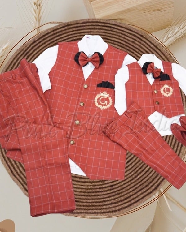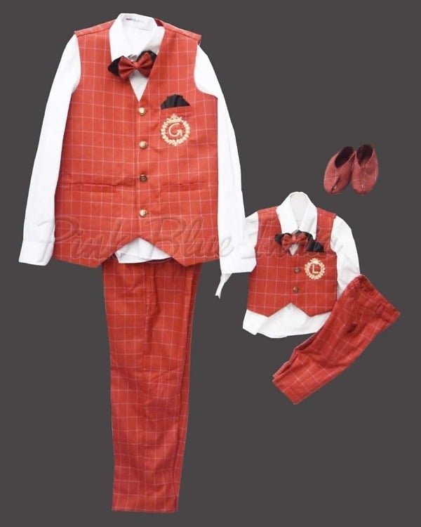 Dress like the best team in the father son matching outfit in red. A classy combination of white shirt with red checks waistcoat, bow tie and pants makes a wonderful matching father and son formal wear for parties this season. Have them put on the coordinated father son blazer or matching daddy baby t-shirts to dress them like a perfect duo for the photoshoot or birthday party. Together, they are going to rock the party with the fantastic father son matching clothing set.