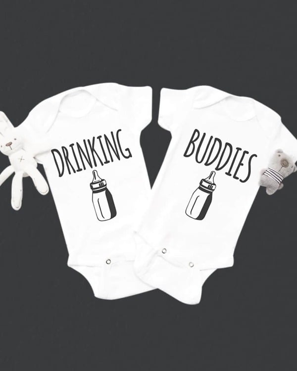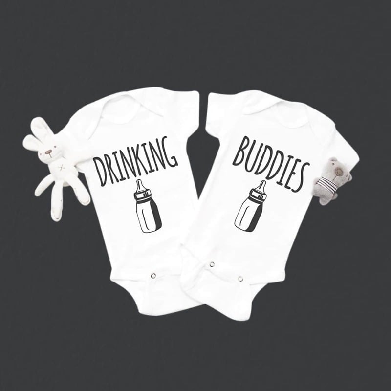 Fun to wear twin baby boy and girl matching outfits to shop online. Have these personalized funny onesies for twins that make the best twin boy girl matching twin funny clothing to dress them from PinkBlueIndia. A cute set of newborn twin clothing make a wonderful funny twins onesie set to gift on baby shower or dress them for photo shoots. Made with finest fabric, it is a super comfy outfit to celebrate “Drinking Buddies”.