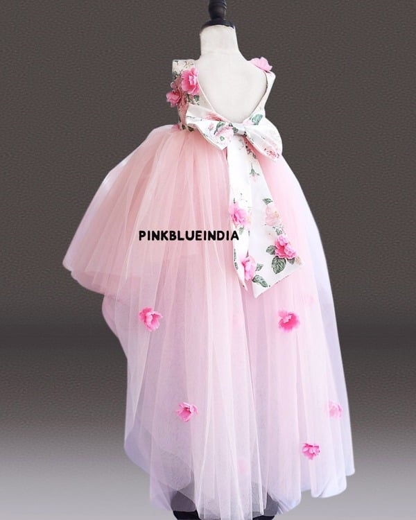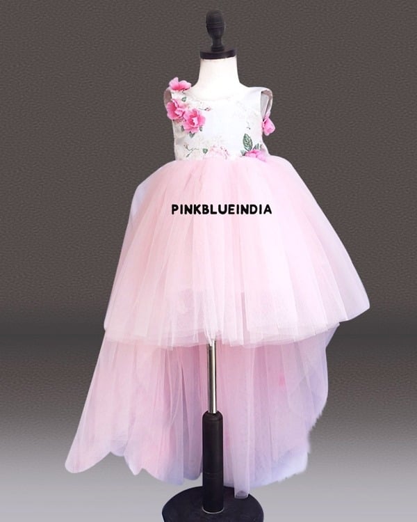 Dress your baby girls between 1 to 15 years of age in this refreshing sleeveless high low tulle girl party dress. It comes with a white bodice with floral print on it and a baby pink high low flare making it a gorgeous delight. This kid high low dress has handmade flowers on the bodice adding extra elegance to it. Add this smart little girl high low dress to her wardrobe and redefine her summer style in the most stunning way!!!