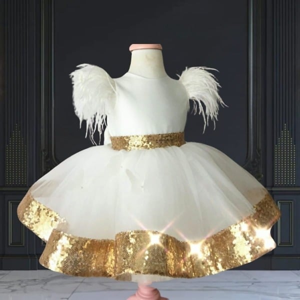 Dedicated to the love for white and gold, this is a gorgeous frock with golden sequins on the waist and around the hem. The feather detailing on the sleeves makes this gold sequins dress stand out. Buy online this exclusive frock for girls in India between 1 to 12 years to have them dressed smartly for birthday parties and weddings. This luxury white gold party dress comes with a complementing headband as well.