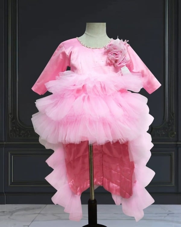 Dress her gorgeous for parties and weddings in this designer fashion pink birthday party dress. Designed using satin and tulle, this ruffled layered high low birthday dress comes with pearl and stone embellishments around the neckline adding a spark to this latest style first birthday princess dress in India. There is a big flower on the bodice. Buy online this lovely party wear for your little one.