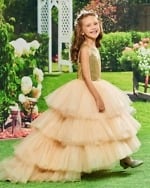 Graceful gold sequins and net birthday gown is a perfect sequins dress for little girls. Sleeveless bodice with sequins and layered net flare makes it a delightful kids party wear dress. Extremely light weight and fabulously fashionable, this flower girl baby birthday dress is just a click away. Shop online baby long frock with matching hair accessory for girls falling in the age bracket of 6 months to 15 years for a refreshingly new look for birthday parties and weddings this season.