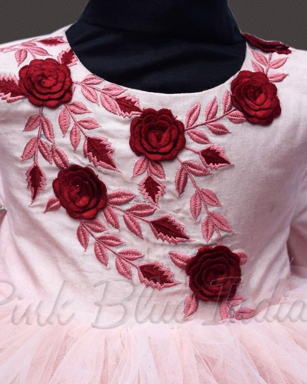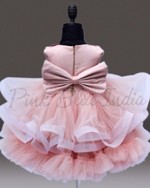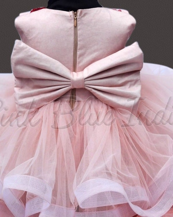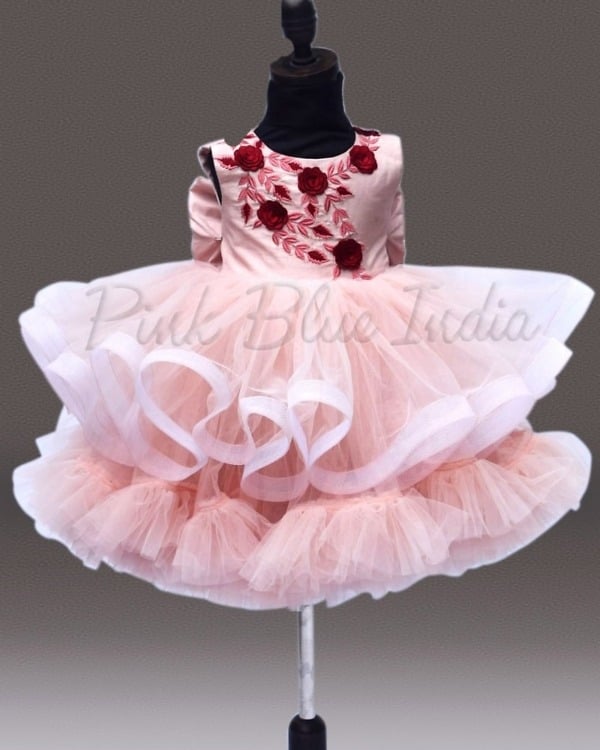 A fabulous first birthday outfit to buy online for your little princess. Pastel pink coloured baby girl frock with bodice embroidered with flowers. It comes with a flare with ruffles and has a complementing headband to complete the look. Dress your twins in this adorable party dress. Perfect for girls between 6 months to 12 years. Have it customized in any colour and size to dress her lovely.