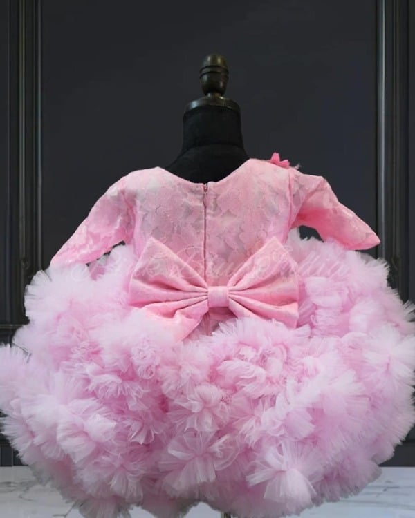 Stylish pink ruffled layered dress net dress for baby girl, toddler and teens. Perfect for birthday and wedding. customize ruffle partywear online.