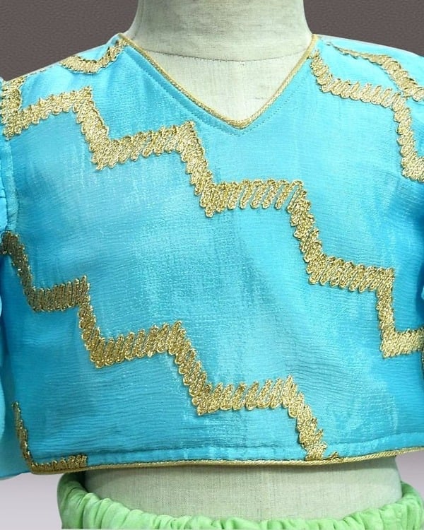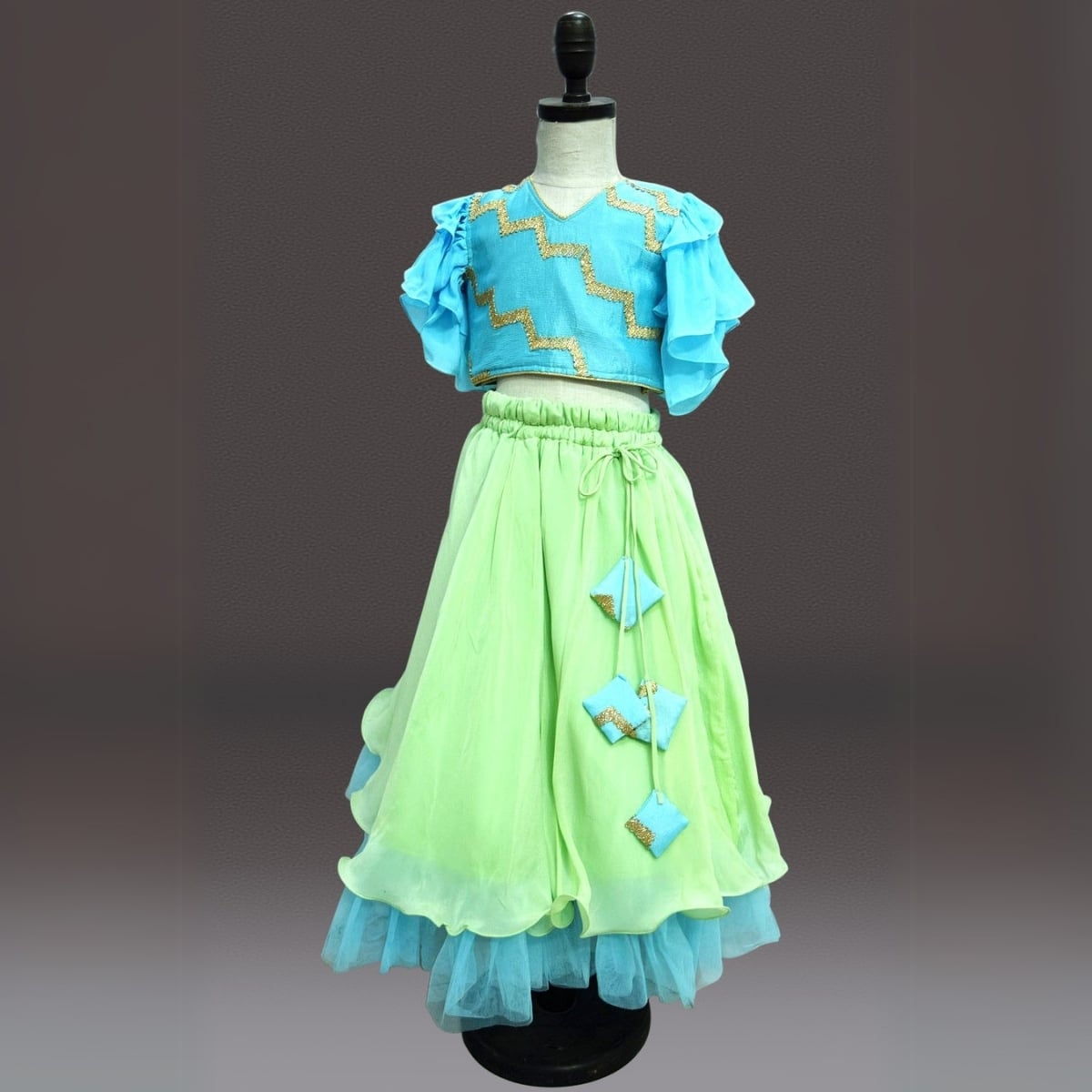 An attractive Girls crop top lehenga to make weddings, festivals, sangeet and receptions fashionable for your princess. Blue crop top with stylish ruffled sleeves and zigzag pattern on Chinnon fabric and double layered lehenga in mint green and blue in net with pretty tassels makes it a perfect designer party wear kids lehenga to shop online for your little one from the best kids online ethnic boutique in India.
