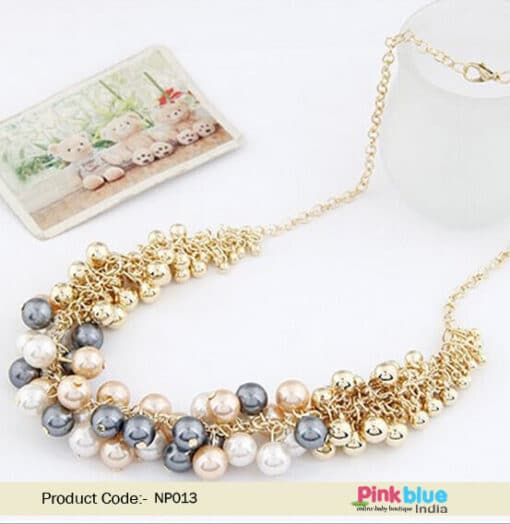 Glamorous Party Wear Necklace for Girls in Golden, White, Grey and Peach Beads
