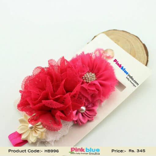 Do you wish to try a completely different gorgeous pretty hair accessory for your girl? If yes, then shop online in India for the stunning pink flower headband with yellow, white and pink flowers in net and satin with embellishment for a stylish and fashionable look of your daughter’s hair. Team it up with designer partywear clothing.