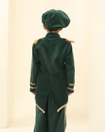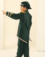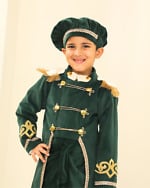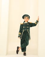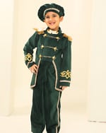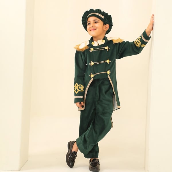 Premium green velvet prince outfit for boys with a royal tail coat look. Ideal for theme birthdays, parties and photoshoots with handcrafted detailing.