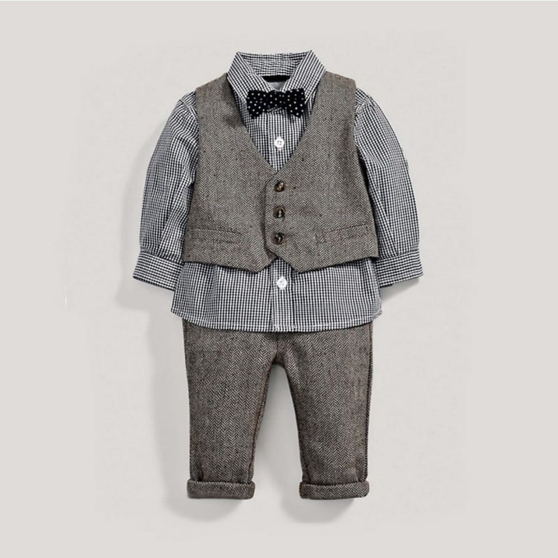 1 review for Baby Boy Grey Waistcoat with Pants and Black Checks Shirt 3 Pcs Clothing Suit