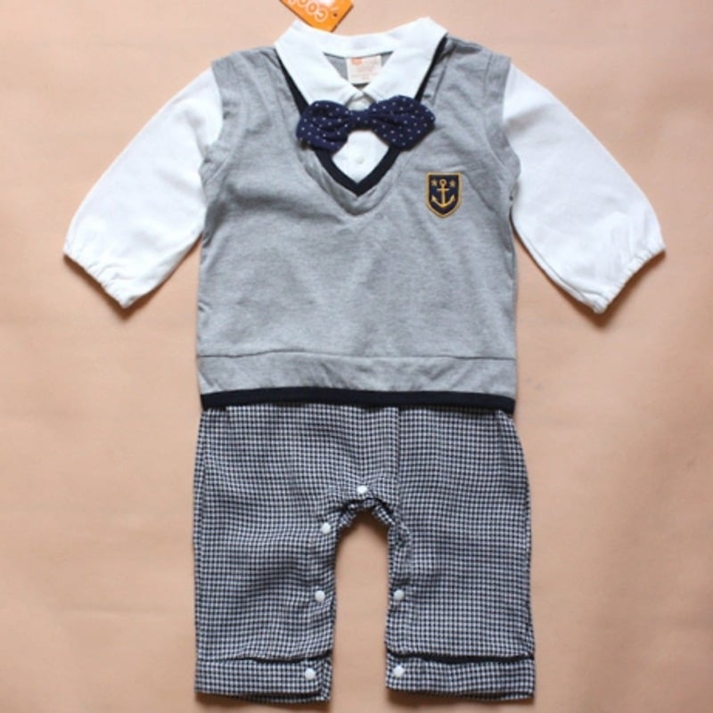 One piece special occasion wear romper set for baby boys. Shop online exclusive romper with white shirt attached with a gray t-shirt and navy blue bow tie with white polka dots on it. It comes with black pants with white checks complementing the complete attire. It fits perfectly on baby falling in age group of 18-24 months to dress them up for special occasions like weddings in an exquisite look for summer and winter season.
