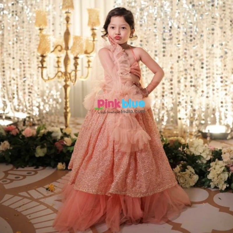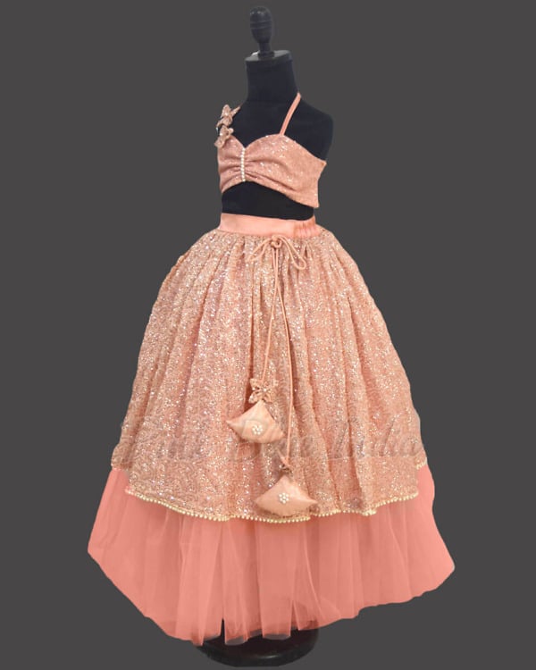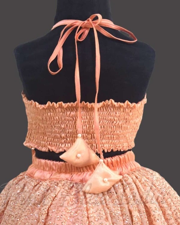 Make wedding celebrations all the more fashionable for girls of age 6 months to 12 years with this peach colored skirt top set. It is a combination of sequins halter neck top and layered skirt in sequins and net. She is going to look really pretty dressed in this trendy outfit featuring beautiful tassels hanging on the side.