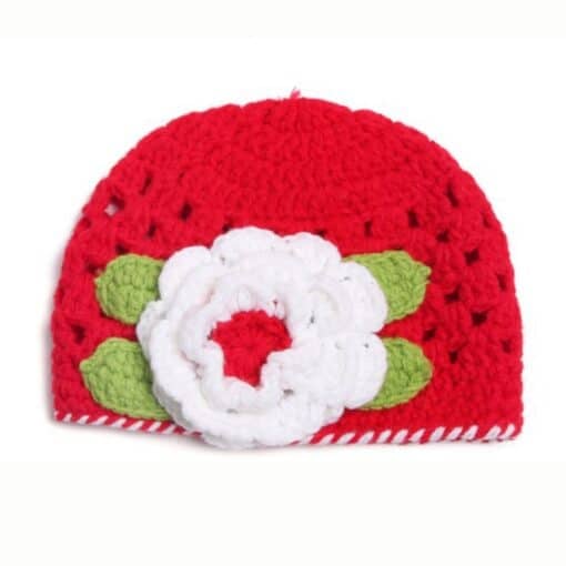 Unique bright red colored handmade crotchet knitted toddlers hat for young babies. It comes with a white flower on the front with leaves on either side. Shop online in India this exquisite infant cap which is up for sale at our store. It is not just an ideal winter cap for your child but also a best photography accessory for your baby.