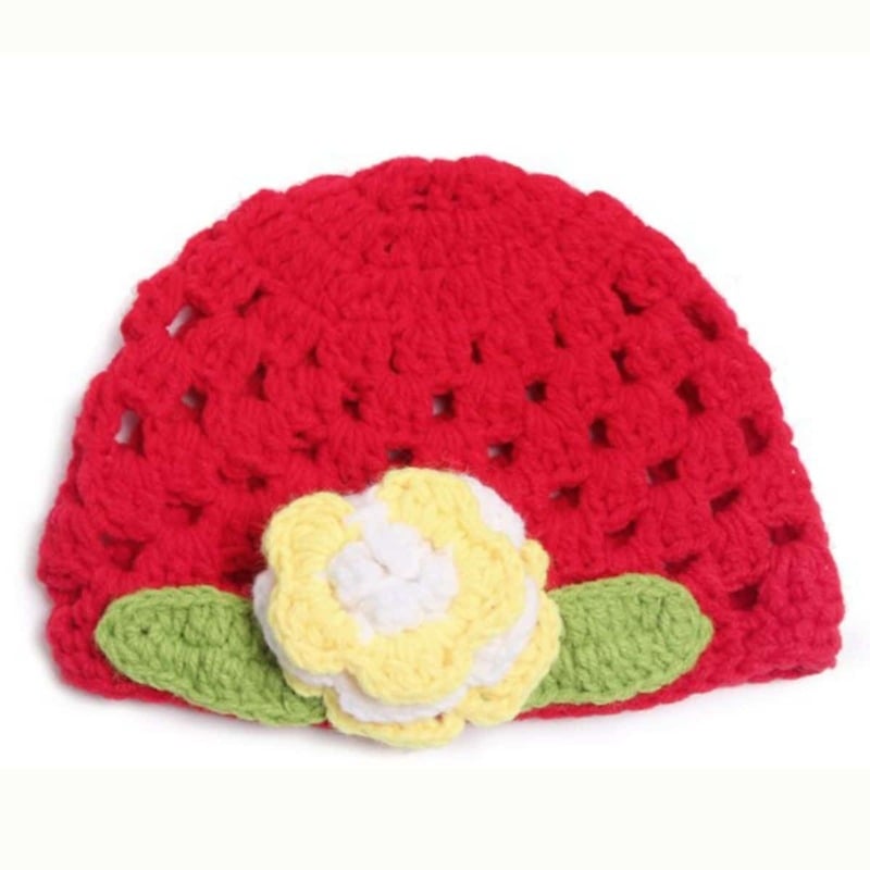Exclusive red colored handmade crotchet knitted cap for young babies. It comes with a yellow and white flower with green leaves on the front. Shop online in India this beautiful baby cap which is up for sale at our store. It is not just an ideal winter cap for your child but also a best photography accessory for your baby.