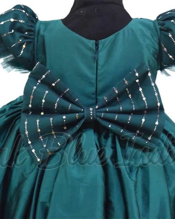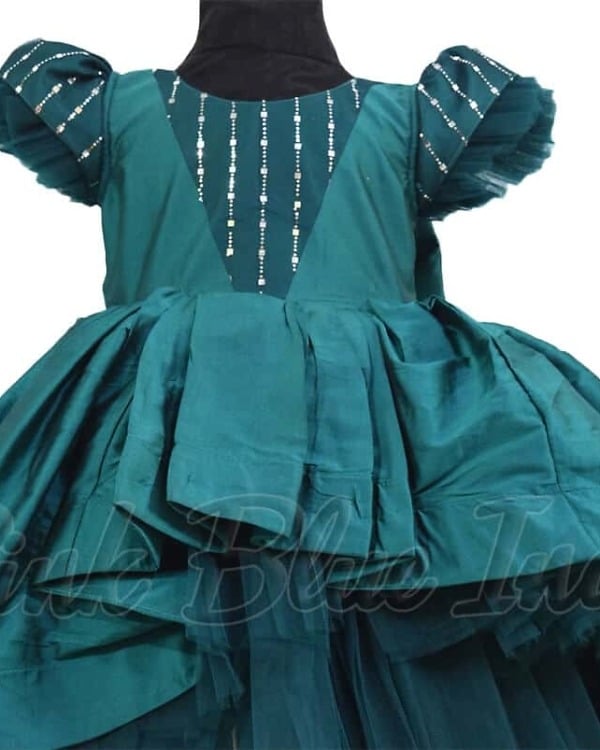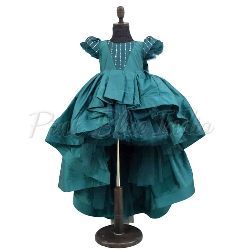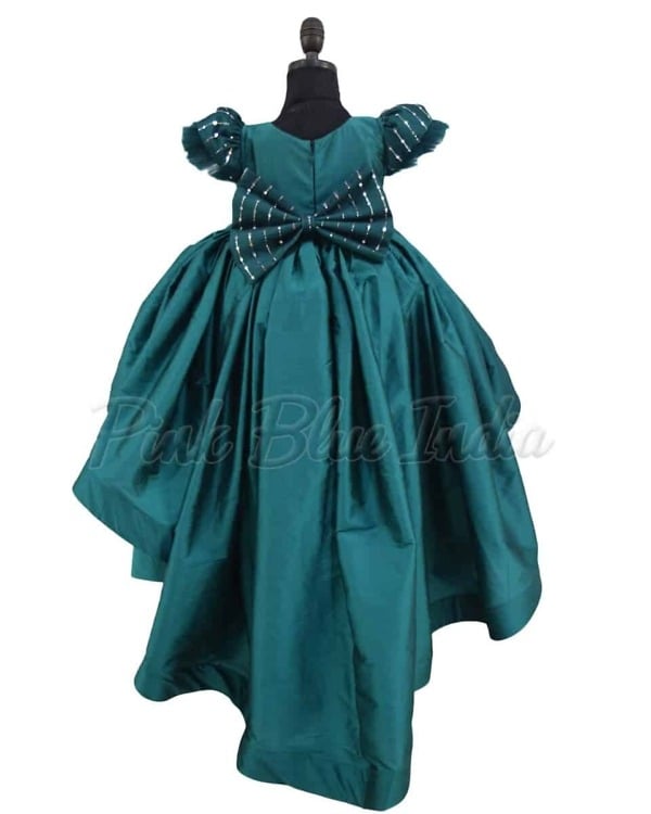 Go with this green colored high low gown designed using silk fabric for baby girls and teenage girls. This designer silk gown comes with a big bow and has a breathtaking flare. The sleeves and bodice are adorned with some sparkling work that adds some shine to this classy outfit. It even includes a matching headband to make sure that your baby girl is ready for birthdays and weddings in no time.