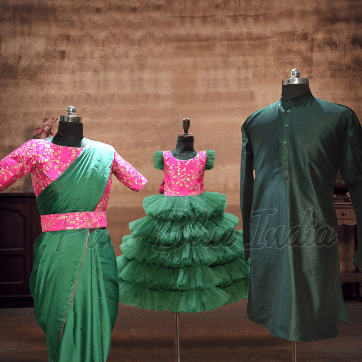 Dressing up as a family is more fun and with this family coordinated outfit collection, you are surely sorted. It is a combination of green colored saree with matching blouse and belt for the mother, an adorable gown in green with pink bodice for the baby girl and a classy green kurta for the father. Designed using premium satin, net and raw silk; this is an outstanding ethnic wear which promises to make weddings, receptions, sangeet, mehandi and festivals more gorgeous for all of your family. Go with this fantastic ethnic party wear that is classy and unique. It even comes with a matching hair accessory for your princess.