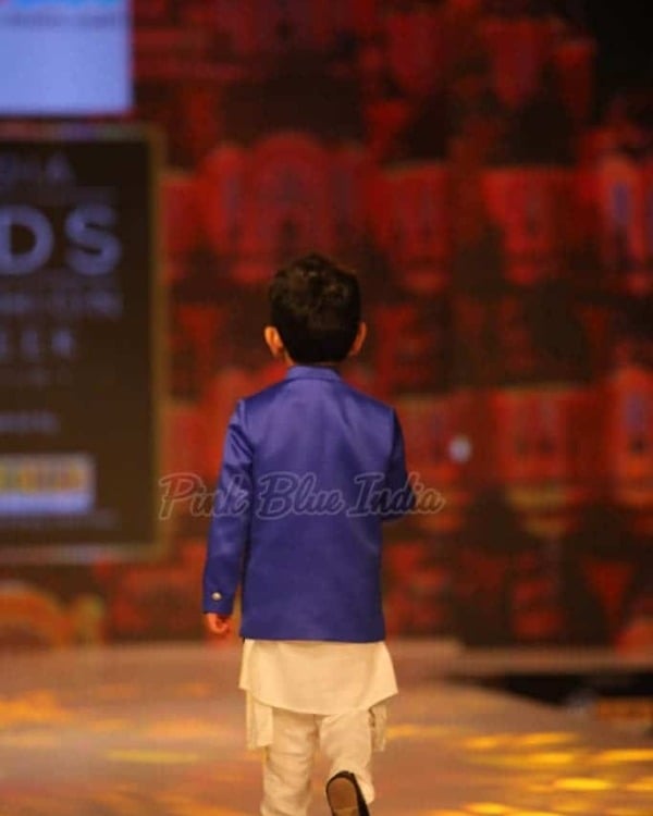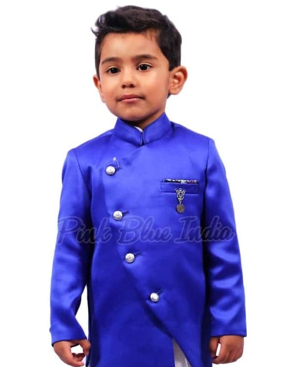 Designed especially for boys between 3-4 years of age, this Indian kids kurta pajama is a pure delight. White pleated kurta and pajama set has been paired with a smart royal blue coloured asymmetrical jacket studded with buttons and brooch. This is certainly a wonderful children ethnic wear to grace special occasions like marriages, sangeet, ring ceremonies and even festivals.
