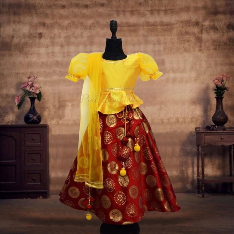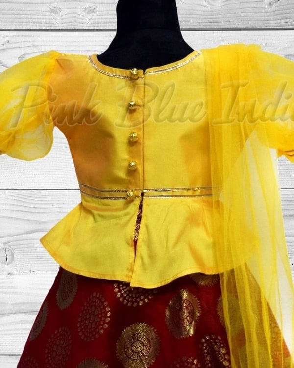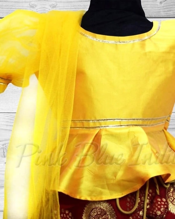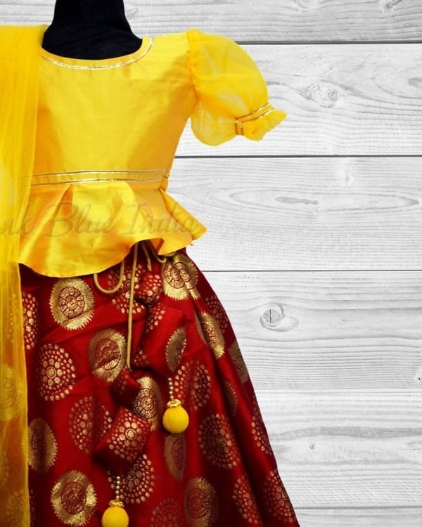 A yellow peplum top in silk with red lehenga in banarasi fabric makes an adorable kids lehenga. The lovely tassels hanging on the side add a resplendent touch to this baby girl lehenga choli which is perfect to be worn for Indian weddings, engagement party, sangeet, mehandi and even festivals like Diwali, Rakhi. Designer lehenga choli for 6 months to 12-15 year girls. Shop baby lehenga dress online which comes with a yellow dupatta for a complete look. The best thing is that it comes with a complementary hair accessory. You can have this red banarasi lehenga customized in different colours as well.