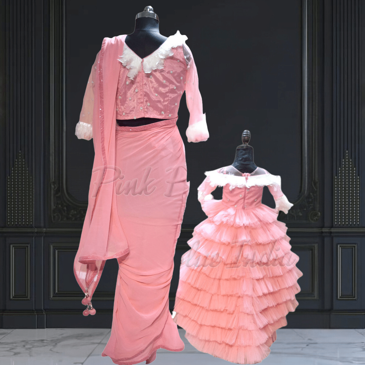 Dressing up for Indian weddings and parties is more gorgeous with this fantastic set of mother daughter twinning outfits in pink color. It is a combination of georgette saree with blouse for the mom and layered gown in net with feather lace for the cute daughter. Available in sizes XS to XXL for mom and 1 to 10 year for baby girls, it makes a desirable matching dress for the duo. It even includes a matching hair accessory to have you complete the look. Don’t forget to get some fashion picks when you dress coordinated.