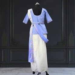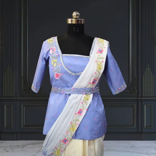 3 piece Indo Western outfit with a peplum top, dhoti skirt and dupatta. Hand work detailing makes it a great pick for parties and special occasions.