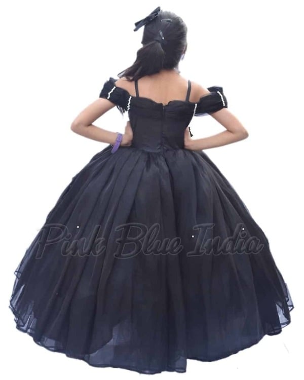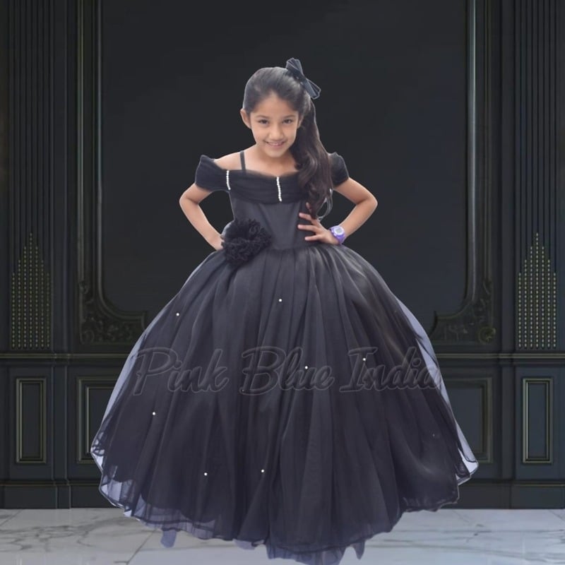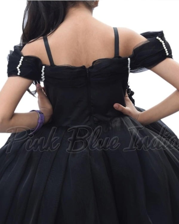 Make her a pretty princess dressed in the black off shoulder party wear dress for girls. The pearl detailing on the shoulder makes it a delightful wear for 1 to 15 years girls. The floral motif on the waist and the gorgeous flare looks flawless. Made with net and tissue, this gown and frock for girls comes with matching hair accessory to promise a breath-taking look for your girl. Buy online kids party wear dress to dress her up for birthdays and weddings in this exclusive trendy wear.