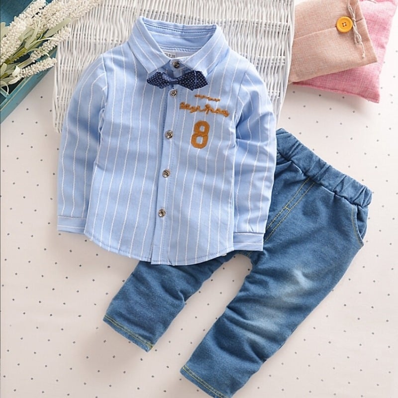 Shop online baby boy party shirt in blue with matching bow tie and denim pants. Have this toddler boy jeans with adjustable waist for an easy kids dress pants in India; must have baby boy bottoms for birthday parties and special occasions like Diwali. The long sleeves boys’ shirt for winters in soothing blue color is made using Cotton + Polyester for a tender feel. Go for this handsome combination suitable for age group 6-12 months, 12-18 months, 18-24 months and 1-2 years. This product is available in yellow and orange color.