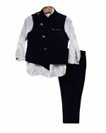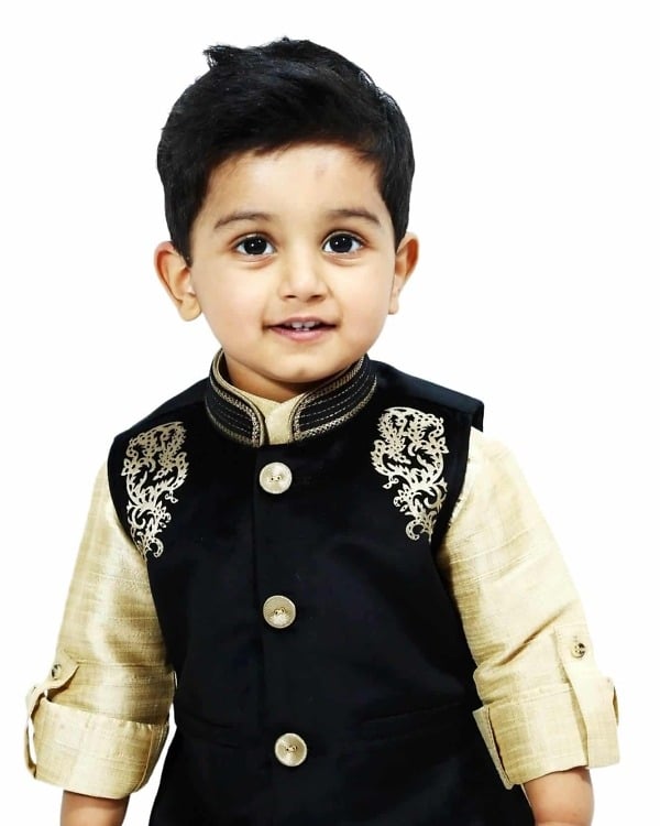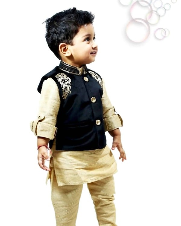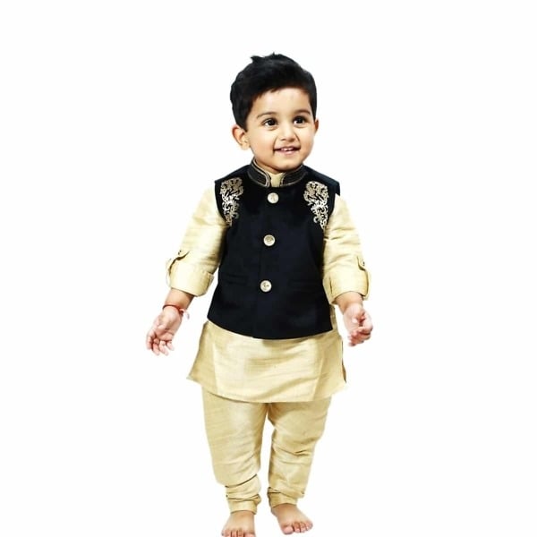 Buy online baby boy wedding wear dresses for kids in India. Exclusive combination of golden kurta and churidar pajama with a smart black shade velvet nehru jacket with laser cut work. The kurta is designed using high quality linen fabric making it soft and comfortable kids indian wear. This dress is a must have children indian festive clothing set to shop online for boys falling in age bracket of 1-2 year, 2-3 years, 3-4 years, 4-5 years, 5-6 years and 6-7 years and dress them gracefully for any special occasions.