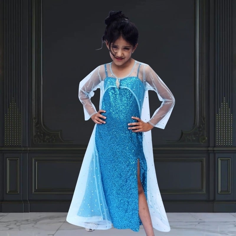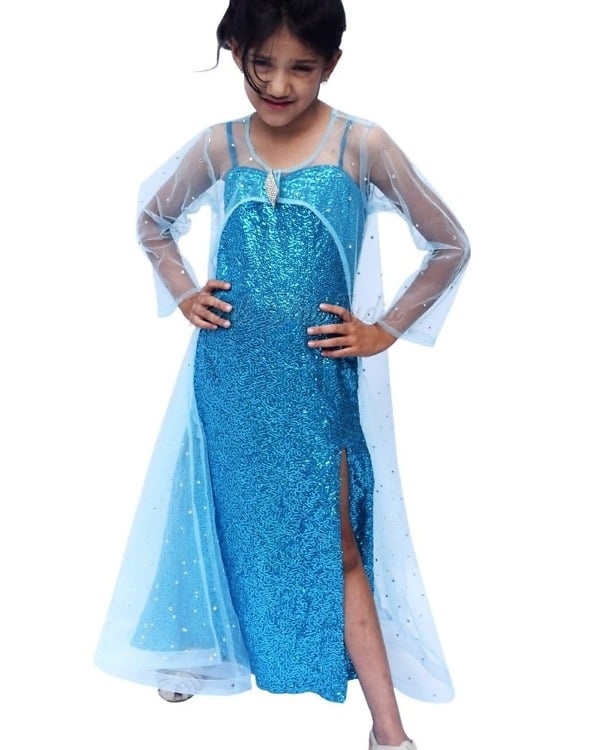 Inspired from Frozen this is a sparkling beautiful Elsa A-line gown to shop online for girls between 1 to 15 years of age. It comes with sequins all over and a detachable jacket studded with stones. There is a slit on the side which adds more glamour to this lovely outfit which sums up fashion for your diva. Dress her pretty in this bright blue Elsa gown for birthday parties and other special occasions.