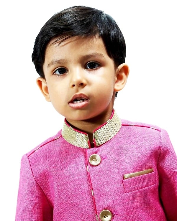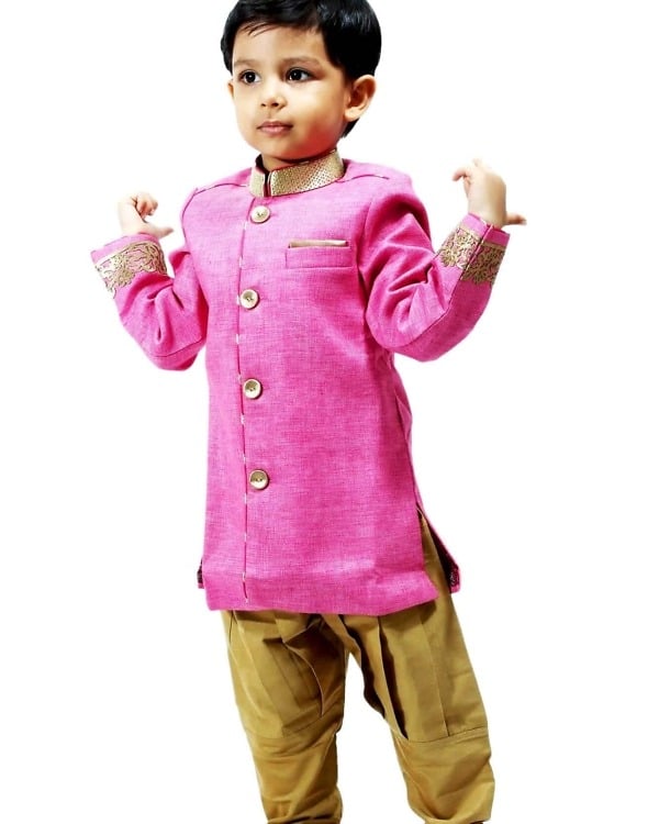 Fabulous boys Indo Western outfit designs to dress them up for special occasions. Baby indo western sherwani suit in pink is teamed with golden breaches making it a perfect occasional and party wear. Kids designer sherwani is crafted using cotton jute fabric. A perfect unique baby Indo Western wedding dress to buy for kids falling in age group of 1-2 year, 2-3 years, 3-4 years, 4-5 years, 5-6 years and 6-7 years to dress them smartly for indian festive occasions, parties and weddings.
