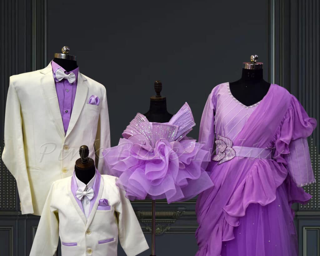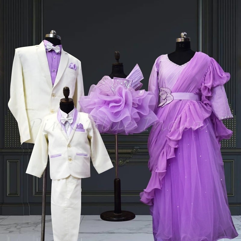 Dress in style with our family matching outfits. Elegant saree for mom, princess dress for girl & tuxedos for dad & son. Perfect for weddings & celebrations.