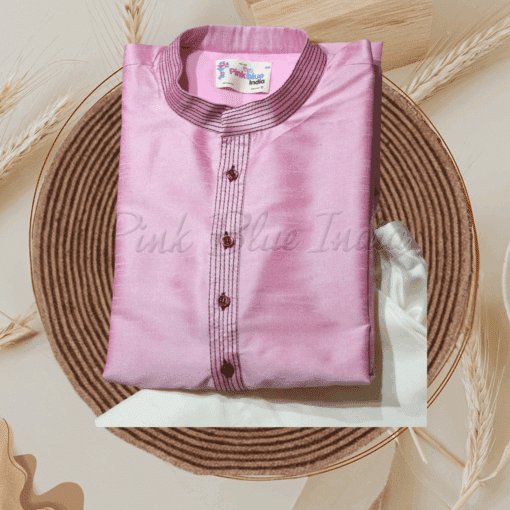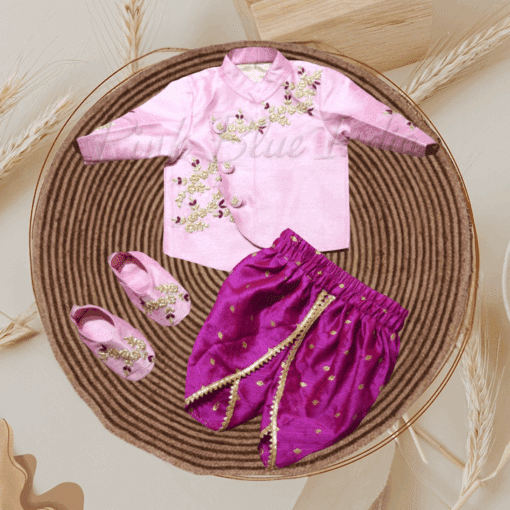 This is one of the cutest ethnic father son combo in pink color. This silk ensemble is a combination of pink silk Dhoti kurta for the baby and pink kurta pajama for the father. The intricate handwork on the kurta of the baby and the matching booties add on to the unique look of this outfit. Buy online this exclusive matching combo for weddings and festivals to have the father son duo dress in synch with each other.