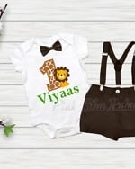 If Lion King is the theme of the birthday celebrations then this brown colored lion themed outfit is just what you need to have your baby boy or girl dressed in. This lion king themed personalized outfit is designed using cotton and is a combination of shirt and pants to make sure that your baby boy or girl is in synch. The shirt features the embroidery which makes it so unique.