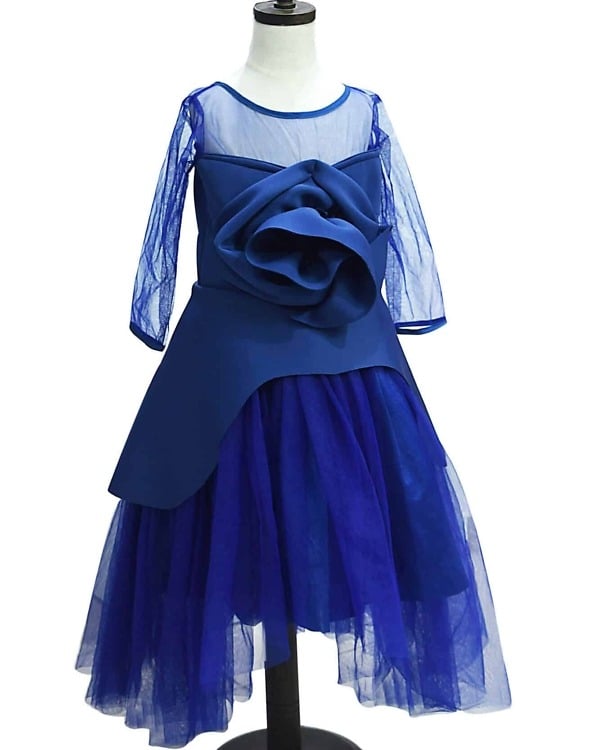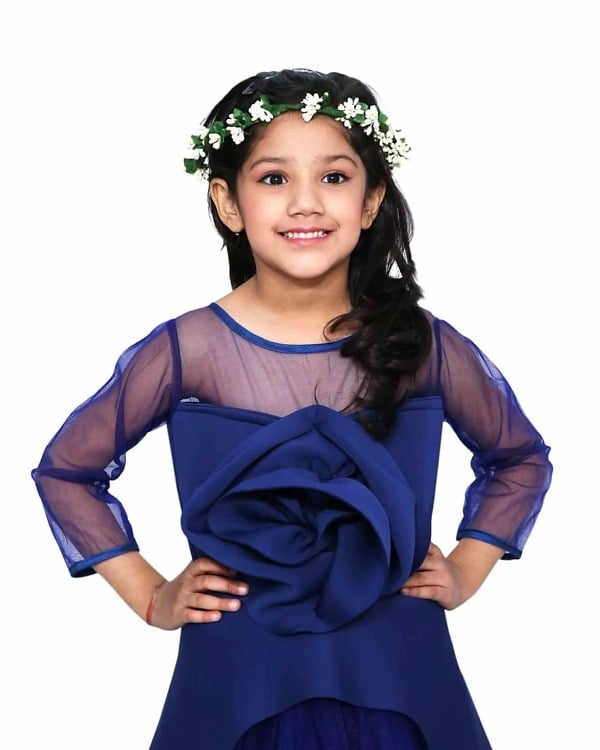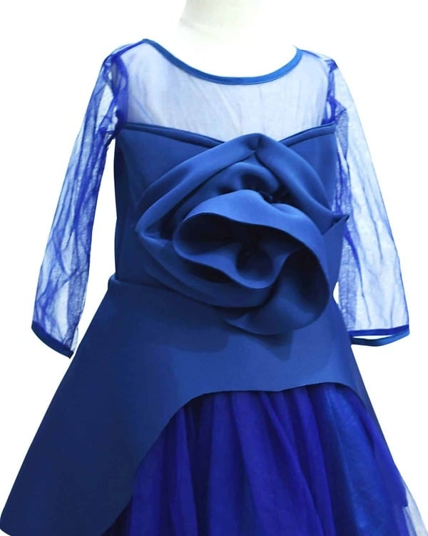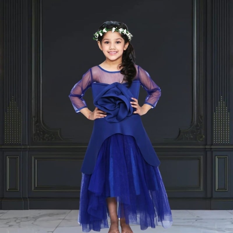 Designer and luxury children’s dress in blue color is an ideal flower girl dress for birthday and wedding season. With neckline and sleeves in sheen pattern and asymmetrical flare, this premium kids’ wear has a beautifully fitting bodice with a big flower on the waist. This is a stunningly gorgeous floor length flower dress for girls and juniors made using Lycra and net, perfect for the wedding season.